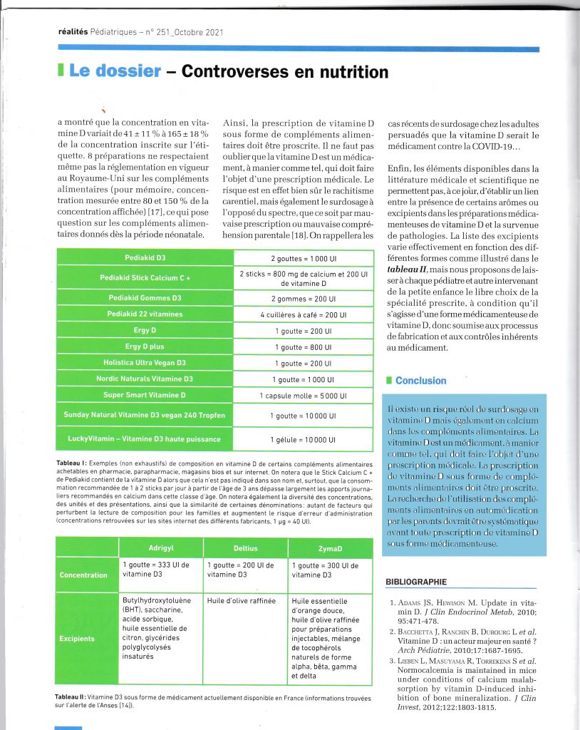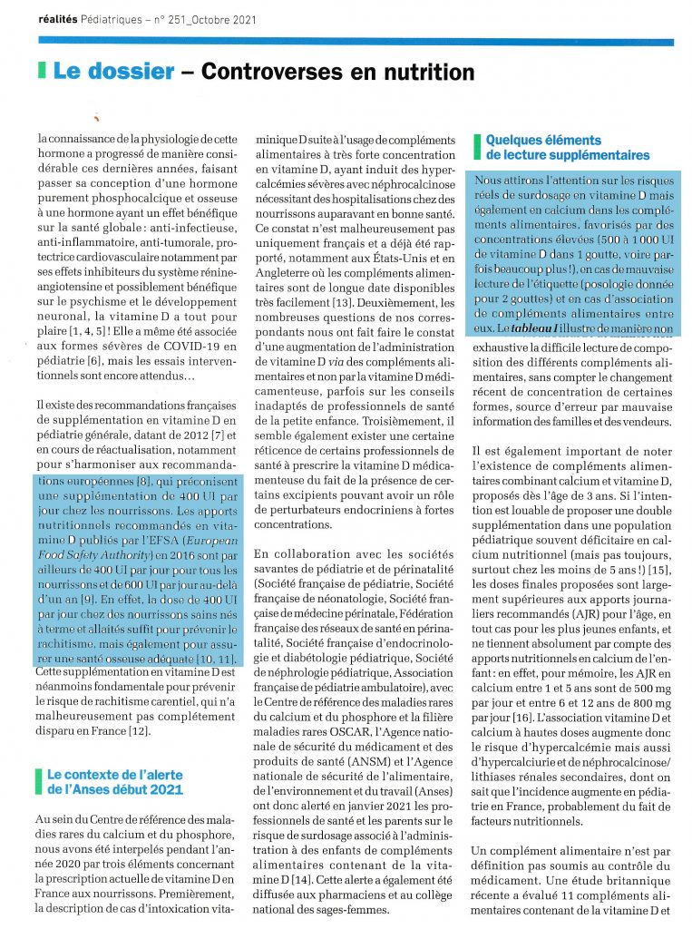Des cas de surdosage en vitamine D ont été recemment rapportés chez des jeunes enfants suite à la prise de compléments alimentaires enrichis en vitamine D. Ces cas se manifestent par une hypercalcémie qui peut avoir des conséquences graves au niveau rénal des lithiases ou des dépôts de calcium dans les reins (néphrocalcinose). Référence ANSES actualité du 27/01/2021